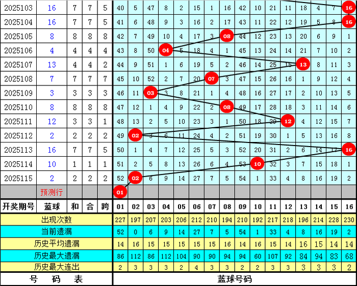 蓝球分析(定义:01-04为一区,05-08为二区,09-12为三区,13-16为四区):上期蓝球开出一区号码02,最近10期蓝球四区落号比为4:2:2:2,总体上各区蓝球走势基本平衡,本期预计蓝球继续在第一区出现,精选一码蓝球01。